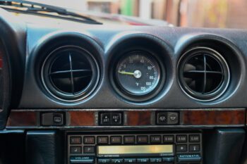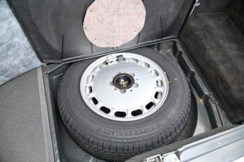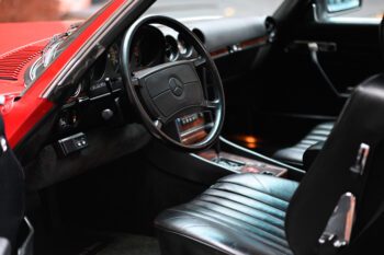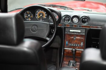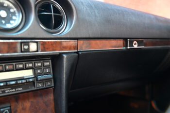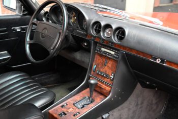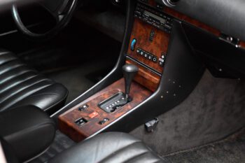 Black leather seats with black carpets for a clean, classic Mercedes luxury look. The cabin features air conditioning and a Becker AM/FM cassette stereo for a period-correct feel.